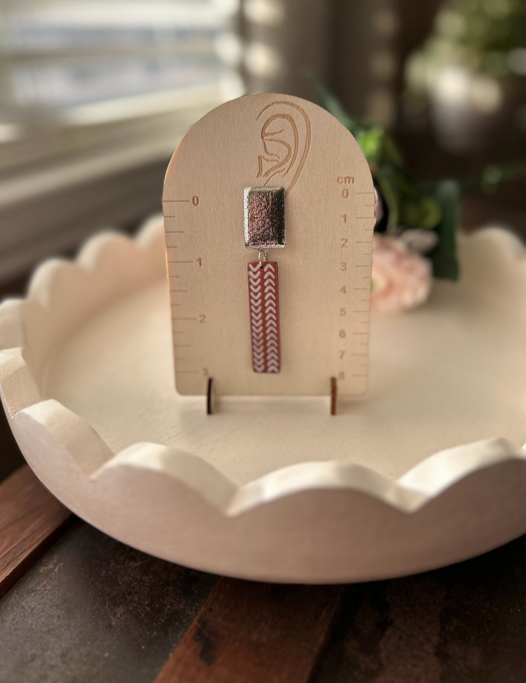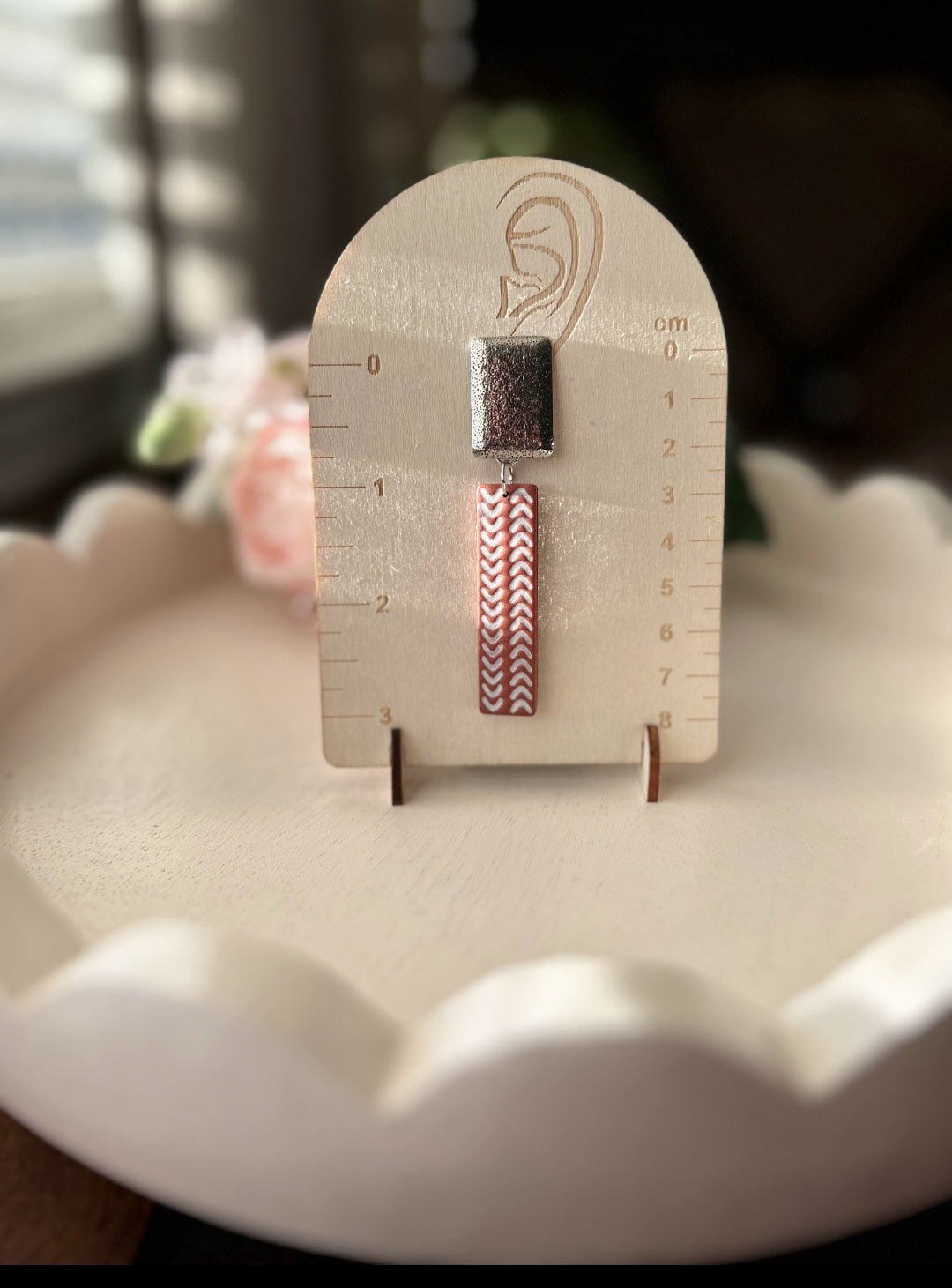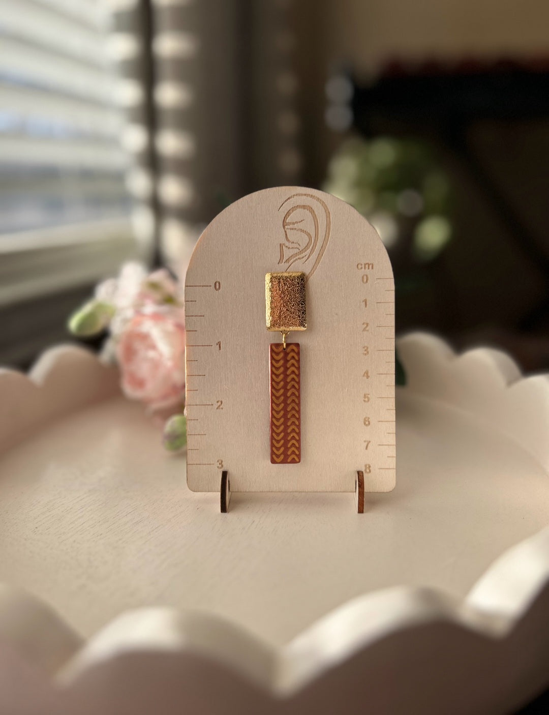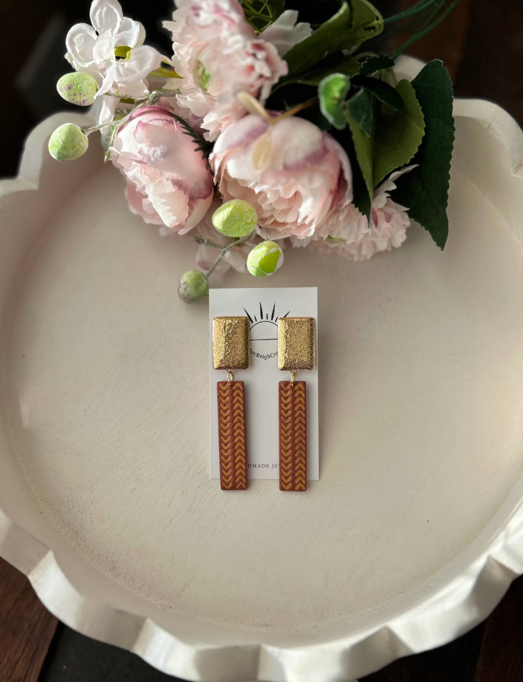 Elevate your accessory collection with these handcrafted statement earrings featuring a fusion of modern elegance and artisanal charm. The design showcases a textured, gold-tone or silver-tone square stud paired with a rectangular clay drop in rich terracotta, embossed with a bold mustard-yellow or silver chevron pattern. These earrings are lightweight and comfortable for all-day wear, making them a perfect choice for both casual and formal looks.