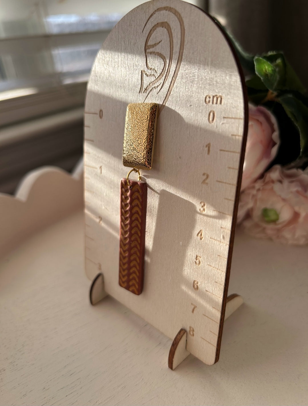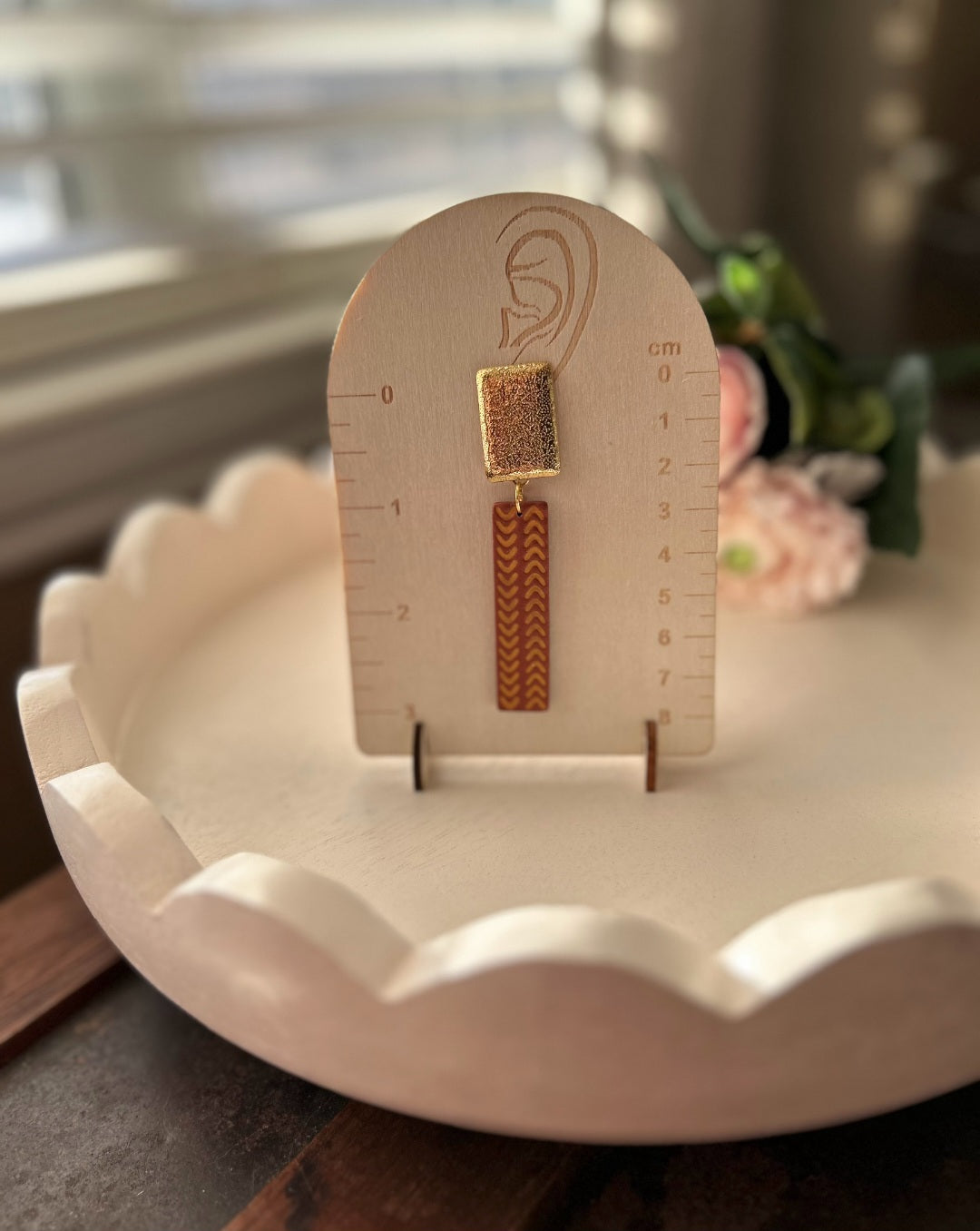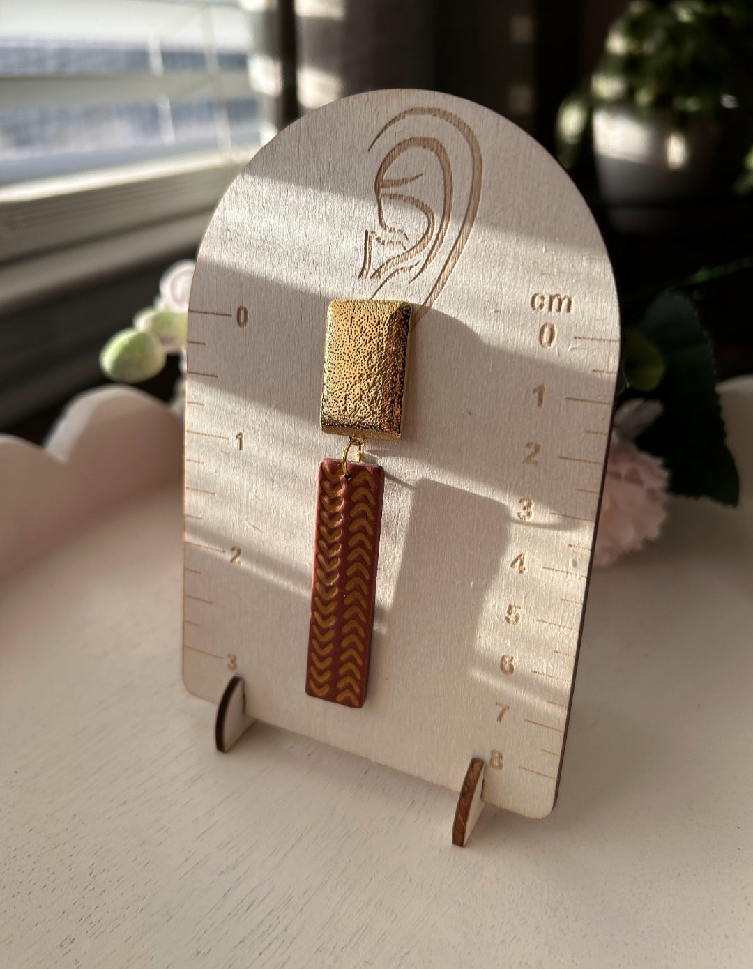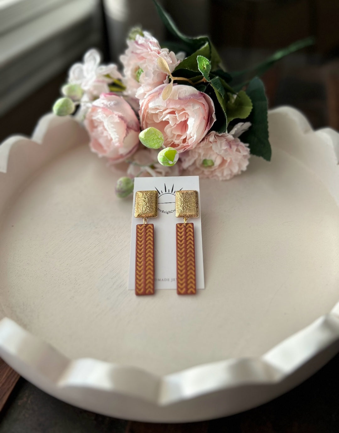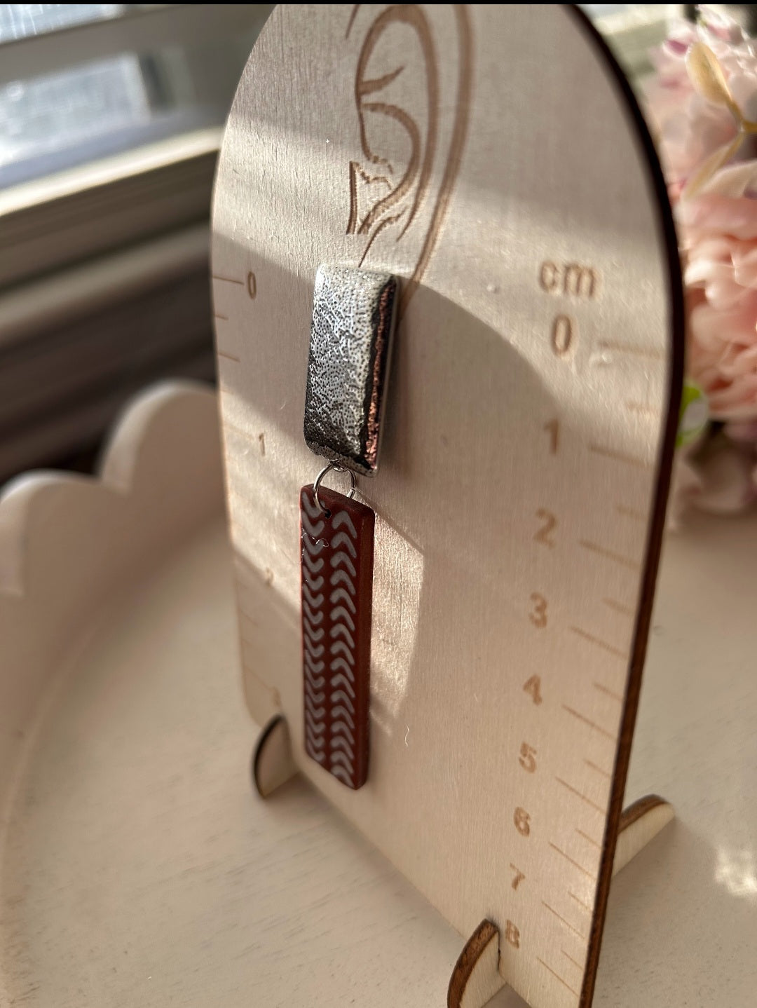 Elevate your accessory collection with these handcrafted statement earrings featuring a fusion of modern elegance and artisanal charm. The design showcases a textured, gold-tone or silver-tone square stud paired with a rectangular clay drop in rich terracotta, embossed with a bold mustard-yellow or silver chevron pattern. These earrings are lightweight and comfortable for all-day wear, making them a perfect choice for both casual and formal looks.