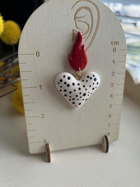 Turn up the heat with these bold, handmade earrings! Featuring fiery red flame toppers and eye-catching black polka-dotted white heart drops, these earrings bring playful edge and artistic flair to any outfit. Crafted with love by SunnyReighCreation, each pair is lightweight, unique, and guaranteed to spark conversation.