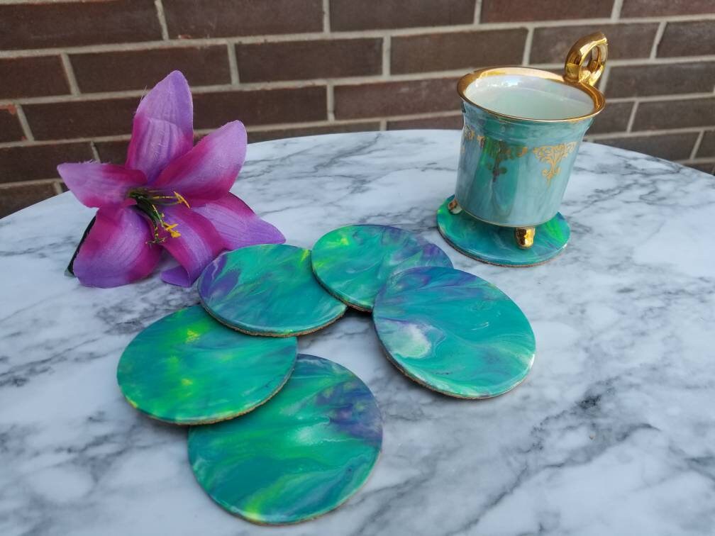This vibrant set includes six 3-inch hand-painted wooden tiles, each uniquely crafted with high-quality acrylic paints and sealed with a glossy, durable resin topcoat. A thin layer of cork backing adds extra durability and protects surfaces from scratches. The color palette features rich shades of purple, blue, neon green, white, and silver, offering a bold and lively accent to any space.