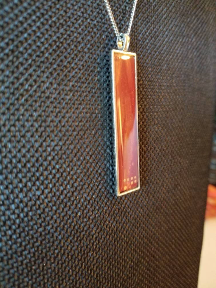 This eye-catching pendant is paired with a sleek, skinny chain, making it the perfect statement piece for any occasion. Each necklace is one-of-a-kind, showcasing the beauty and creativity of handcrafted art. The gold dots represent the maker's initials, spelled out in Braille.