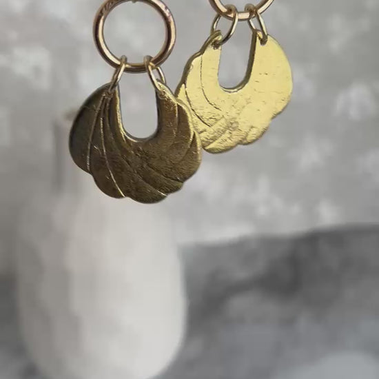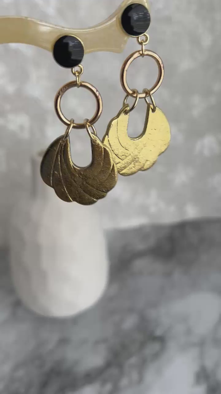Elegant and eye-catching, these vintage-inspired drop earrings feature a bold black cabochon stud that leads into a gold-tone circular link and a beautifully textured fan-shaped charm made of polymer clay. The metallic fan elements have a subtle feathered design that adds movement and sophistication to the piece. Lightweight and versatile, these earrings effortlessly transition from daytime chic to evening glamour. Ideal for those who appreciate timeless design with a modern twist.